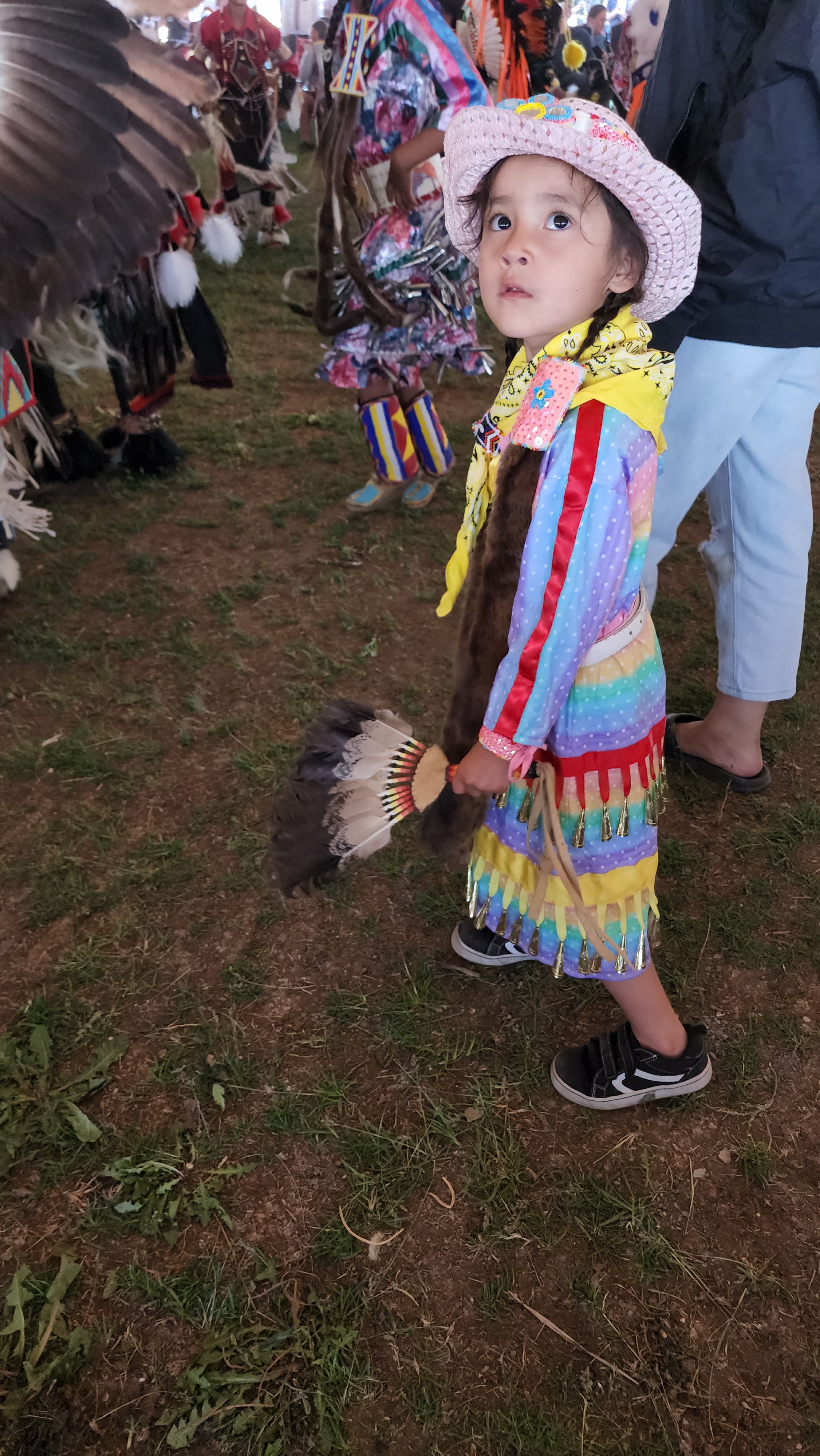 At the beginning of a powwow, there is a "Grand Entry." During that Grand Entry, everyone rises to their feet as an elder leads a parade of dancers into a round arena. Participants hold flags that represent the tribes in attendance. Drums beat out the grand entry song and the dancers join together in an opening dance.